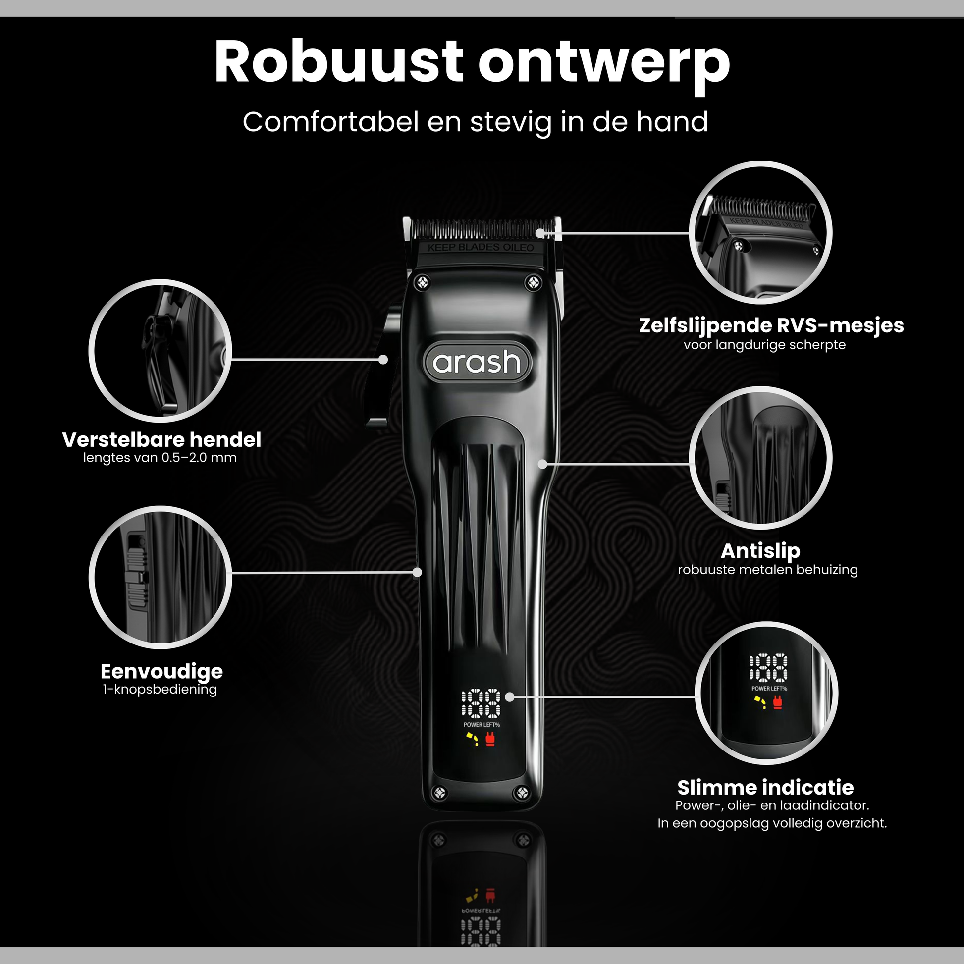 Met de arash® professionele tondeuse- en baardtrimmerset van heb je alles wat je nodig hebt voor precisie en controle – in één complete set.